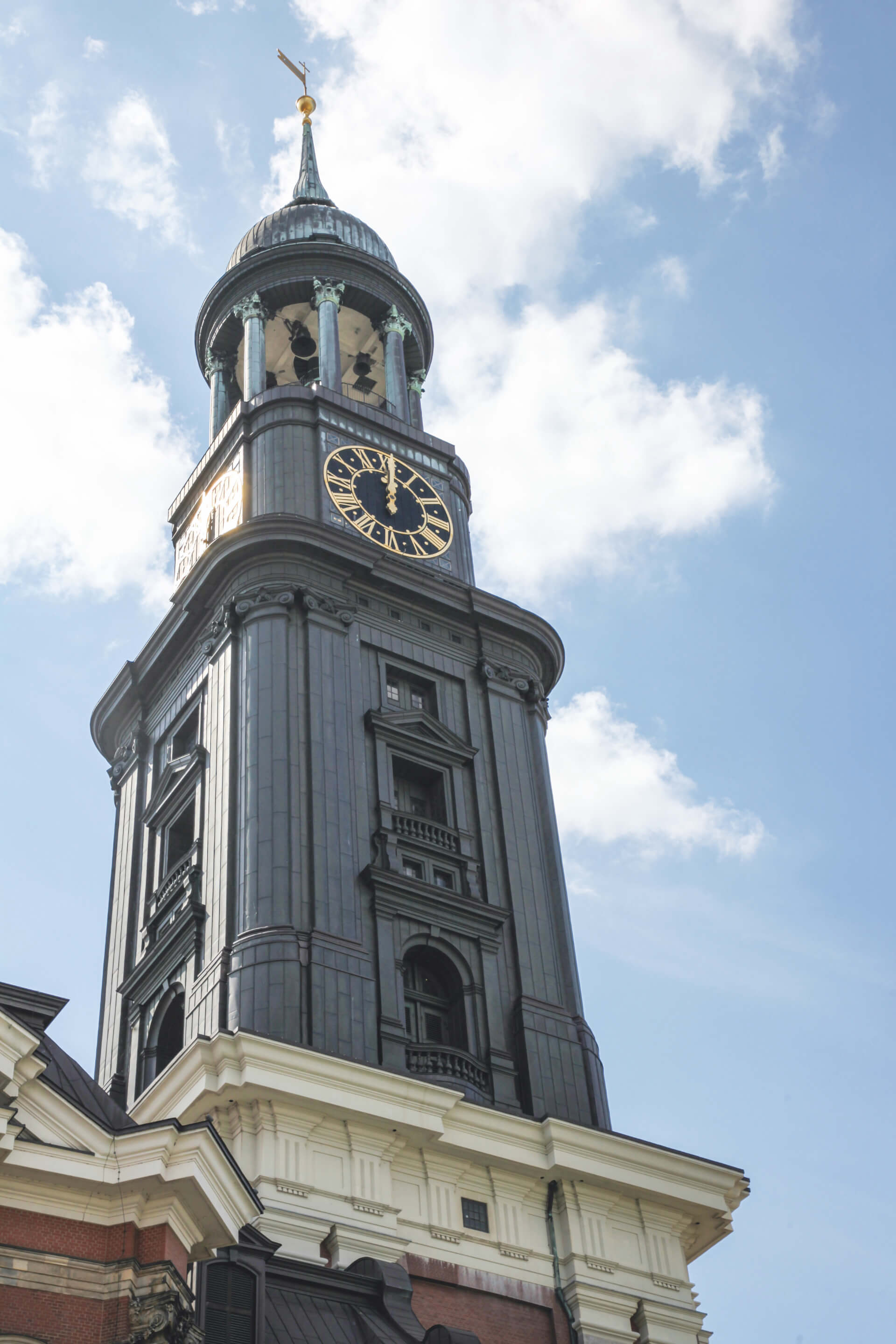 Dass Corona auch positive Seiten hat, erfahren wir gleich bei der Ankunft an der Barockkirche unweit des Hafens und der Landungsbrücken: Der Aufstieg über die 452 Stufen hinauf zur Aussichtsplattform bleibt uns pandemiebedingt erspart. Das Hygienekonzept sieht vor, dass alle Besucher, die hinauf möchten, in Zweier- oder Vierergruppen mit dem Aufzug fahren. Aus 82 Metern Höhe wird der Besucher mit einem eindrucksvollen Panoramablick auf die Elbe und den Rest der Metropole belohnt. Abwärts geht es dann zu Fuß über die besagten Treppenstufen nach unten. An bestimmten Tagen wird auch nachts eine Begehung des Turms angeboten. Hierfür sollte man vorsichtshalber eine Reservierung vornehmen. Da die Zugangszeiten unter Umständen durch stattfindende Messen und Gottesdienste variieren, sollte man sich vor einem geplanten Besuch auch darüber informieren.