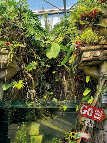 Wenn man sich den Weg durch die Sicherheitskorridore erobert hat, gelangt man in ein großes Schmetterlingshaus. Auch wenn‘s außerhalb schon wohltemperiert ist, gesellt sich hier drinnen noch eine tropische Feuchtigkeit dazu. Wer ein wenig schreckhaft ist, erlebt nun »die große Flatter«: Zahlreiche bunte und exotische Falter fliegen hier frei herum und steuern scheinbar rastlos die dicht stehende Botanik dieser Tropenlandschaft an. Als Besucher wähnt man sich spontan nicht nur in einer anderen Klimazone, sondern auch auf einem anderen Kontinent.